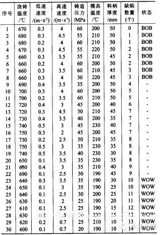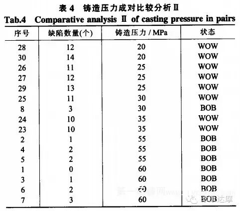 選出模具壓鑄成型質(zhì)量違禁詞(即BestofBest,簡稱BOB)的8組數(shù)據(jù),模具壓鑄成型質(zhì)量最差的(即WorstofWorst,簡稱wow)8組數(shù)據(jù)。然后把相關(guān)的每個質(zhì)量參數(shù)與被調(diào)查結(jié)果分別進(jìn)行組隊,按每個質(zhì)量參數(shù)實測值由小到大(或相反)的次序進(jìn)行排列。以鑄造壓力為例,將鑄造壓力與模具壓鑄成型的缺陷數(shù)量(表征了模具壓鑄成型質(zhì)量)組隊,先按模具壓鑄成型的缺陷數(shù)量由小到大的次序進(jìn)行排列.如表3所示:再按鑄造壓力從小到大的次序重新排列.見表4所示。