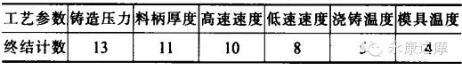 (2)模具壓鑄成型質(zhì)量的工藝參數(shù)中:鑄造壓力、料柄厚度、高速速度、低速速度的終結(jié)計數(shù)分別為13、11、10、8,這4個參數(shù)的置信度均t>90%。